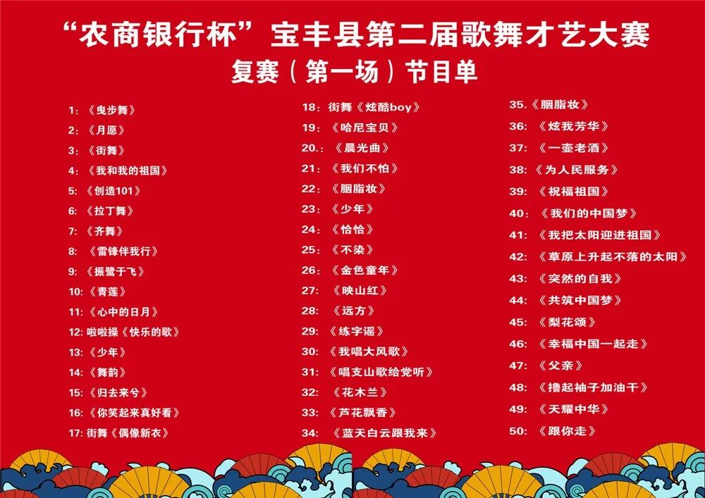 据宝丰县音乐舞蹈家协会主席姚朝峰介绍,本场复赛,所有晋级复赛比赛节目分组编排,前三个演出节目不打分,前三个演出节目不打分,从第四个节目开始打分。主持人不宣读比赛者姓名、参演单位,评委只对相应号牌打分,最后取五位评委的平均分(精确到小数点后三位小数)作为复赛成绩。待两场复赛全部结束,根据总决赛设置奖项比例,从高到低,评选出参加总决赛的节目名单,充分体现比赛的公平、公正原则。